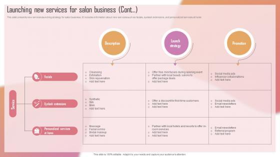 This slide presents new services launching strategy for salon business. It t includes information about new services such as nail care, makeup services and massage services. Create an editable Customizing The Salon Experience Launching New Services For Salon Business Strategy SS V that communicates your idea and engages your audience. Whether you are presenting a business or an educational presentation, pre-designed presentation templates help save time. Customizing The Salon Experience Launching New Services For Salon Business Strategy SS V is highly customizable and very easy to edit, covering many different styles from creative to business presentations. Slidegeeks has creative team members who have crafted amazing templates. So, go and get them without any delay. This slide presents new services launching strategy for salon business. It t includes information about new services such as nail care, makeup services and massage services.