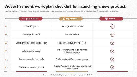 Entire slide depicts the checklist for the marketing work plan when introducing a new product to achieve all the parameters efficiently. The parameters are SMART goals unique selling proposition,etc.. Showcasing this set of slides titled Advertisement Work Plan Checklist For Launching A New Product Rules PDF. The topics addressed in these templates are Parameters, Key Activities, Status . All the content presented in this PPT design is completely editable. Download it and make adjustments in color, background, font etc. as per your unique business setting.