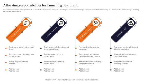 This slide showcases roles and responsibilities to be allocated to employees for running brand marketing and advertisement campaigns. Employees involved in brand marketing are content creator, content manager, marketing executive and brand manager. Boost your pitch with our creative Allocating Responsibilities For Launching New Product Advertising And Positioning Slides Pdf. Deliver an awe-inspiring pitch that will mesmerize everyone. Using these presentation templates you will surely catch everyones attention. You can browse the ppts collection on our website. We have researchers who are experts at creating the right content for the templates. So you do not have to invest time in any additional work. Just grab the template now and use them. This slide showcases roles and responsibilities to be allocated to employees for running brand marketing and advertisement campaigns. Employees involved in brand marketing are content creator, content manager, marketing executive and brand manager.