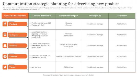 This templates shows calendar for the communication of new products. The purpose of this slide is to deliverable relevant content on time to easily communicate with target audience regarding new launch pf product. It includes platforms such as Facebook, Instagram, snapchat, Pinterest, etc. Showcasing this set of slides titled Communication Strategic Planning For Advertising New Product Background Pdf. The topics addressed in these templates are Snapchat, Pinterest, Twitter. All the content presented in this PPT design is completely editable. Download it and make adjustments in color, background, font etc. as per your unique business setting. This templates shows calendar for the communication of new products. The purpose of this slide is to deliverable relevant content on time to easily communicate with target audience regarding new launch pf product. It includes platforms such as Facebook, Instagram, snapchat, Pinterest, etc.