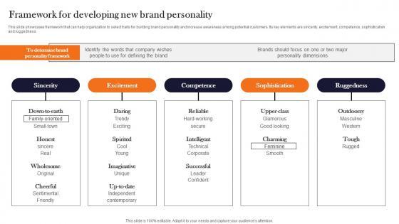 This slide showcases framework that can help organization to select traits for building brand personality and increase awareness among potential customers. Its key elements are sincerity, excitement, competence, sophistication and ruggedness. This modern and well-arranged Framework For Developing New Brand Personality Product Advertising And Positioning Structure Pdf provides lots of creative possibilities. It is very simple to customize and edit with the Powerpoint Software. Just drag and drop your pictures into the shapes. All facets of this template can be edited with Powerpoint, no extra software is necessary. Add your own material, put your images in the places assigned for them, adjust the colors, and then you can show your slides to the world, with an animated slide included. This slide showcases framework that can help organization to select traits for building brand personality and increase awareness among potential customers. Its key elements are sincerity, excitement, competence, sophistication and ruggedness.