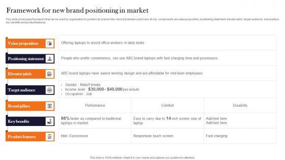 This slide showcases framework that can be used by organization to position its brand in the mind of potential customers. Its key components are value proposition, positioning statement, elevator pitch, target audience, brand pillars, key benefits and product features. This Framework For New Brand Positioning In Market Product Advertising And Positioning Download Pdf is perfect for any presentation, be it in front of clients or colleagues. It is a versatile and stylish solution for organizing your meetings. The Framework For New Brand Positioning In Market Product Advertising And Positioning Download Pdf features a modern design for your presentation meetings. The adjustable and customizable slides provide unlimited possibilities for acing up your presentation. Slidegeeks has done all the homework before launching the product for you. So, do not wait, grab the presentation templates today This slide showcases framework that can be used by organization to position its brand in the mind of potential customers. Its key components are value proposition, positioning statement, elevator pitch, target audience, brand pillars, key benefits and product features.