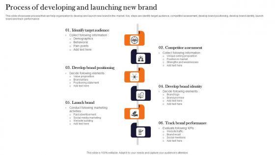 This slide showcases process that can help organization to develop and launch new brand in the market. Key steps are identify target audience, competitor assessment, develop brand positioning, develop brand identity, launch brand and track performance. Slidegeeks is one of the best resources for PowerPoint templates. You can download easily and regulate Process Of Developing And Launching New Product Advertising And Positioning Infographics Pdf for your personal presentations from our wonderful collection. A few clicks is all it takes to discover and get the most relevant and appropriate templates. Use our Templates to add a unique zing and appeal to your presentation and meetings. All the slides are easy to edit and you can use them even for advertisement purposes. This slide showcases process that can help organization to develop and launch new brand in the market. Key steps are identify target audience, competitor assessment, develop brand positioning, develop brand identity, launch brand and track performance.