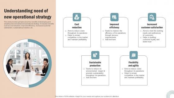 This slide provides glimpse about key benefits of developing and adopting new and advanced operational strategy. It includes benefits such as cost reduction, improved efficiency, increased customer satisfaction, sustainable production, etc. Slidegeeks is here to make your presentations a breeze with Understanding Need New Operations Strategy Improve Business Productivity Graphics Pdf With our easy to use and customizable templates, you can focus on delivering your ideas rather than worrying about formatting. With a variety of designs to choose from, you are sure to find one that suits your needs. And with animations and unique photos, illustrations, and fonts, you can make your presentation pop. So whether you are giving a sales pitch or presenting to the board, make sure to check out Slidegeeks first This slide provides glimpse about key benefits of developing and adopting new and advanced operational strategy. It includes benefits such as cost reduction, improved efficiency, increased customer satisfaction, sustainable production, etc.