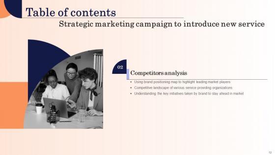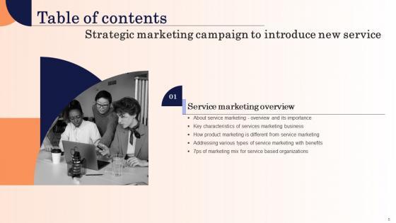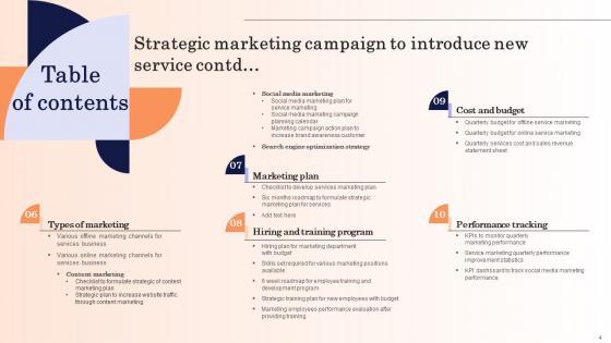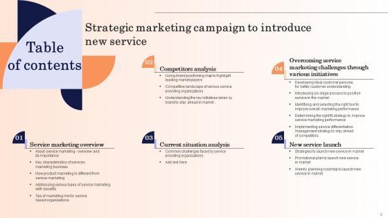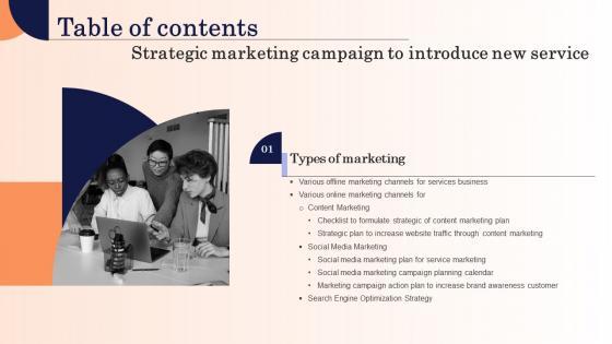 Want to ace your presentation in front of a live audience Our Strategic Marketing Campaign To Introduce New Service Table Of Contents Designs Pdf can help you do that by engaging all the users towards you.. Slidegeeks experts have put their efforts and expertise into creating these impeccable powerpoint presentations so that you can communicate your ideas clearly. Moreover, all the templates are customizable, and easy-to-edit and downloadable. Use these for both personal and commercial use. Our Strategic Marketing Campaign To Introduce New Service Table Of Contents Designs Pdf are topically designed to provide an attractive backdrop to any subject. Use them to look like a presentation pro.