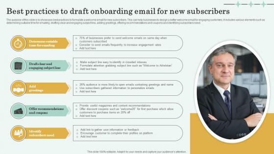 The purpose of this slide is to showcase best practices to formulate a welcome email for new subscribers. This can help businesses to design a better welcome email for engaging customers. It includes various elements such as determining suitable time for emailing, drafting clear and engaging subject line, adding greetings, offering recommendations and coupons and identifying subscribers need. Pitch your topic with ease and precision using this Best Practices To Draft Onboarding Email For New Subscribers Information Pdf. This layout presents information on Determine Suitable, Add Greetings, Offer Recommendations Coupons. It is also available for immediate download and adjustment. So, changes can be made in the color, design, graphics or any other component to create a unique layout. The purpose of this slide is to showcase best practices to formulate a welcome email for new subscribers. This can help businesses to design a better welcome email for engaging customers. It includes various elements such as determining suitable time for emailing, drafting clear and engaging subject line, adding greetings, offering recommendations and coupons and identifying subscribers need.