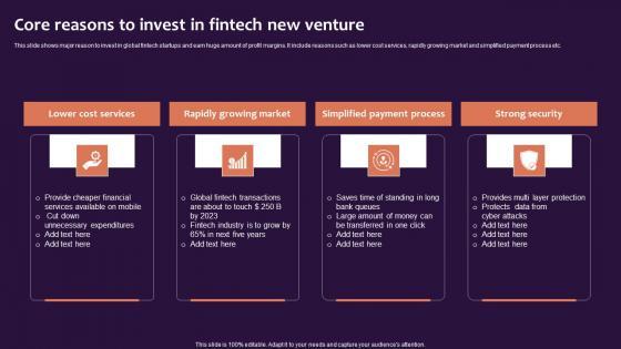 This slide shows major reason to invest in global fintech startups and earn huge amount of profit margins. It include reasons such as lower cost services, rapidly growing market and simplified payment process etc. Showcasing this set of slides titled Core Reasons To Invest In Fintech New Venture Graphics Pdf. The topics addressed in these templates are Lower Cost Services, Rapidly Growing Market, Simplified Payment Process. All the content presented in this PPT design is completely editable. Download it and make adjustments in color, background, font etc. as per your unique business setting. This slide shows major reason to invest in global fintech startups and earn huge amount of profit margins. It include reasons such as lower cost services, rapidly growing market and simplified payment process etc.