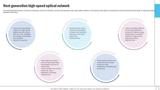 This slide describes the future of photonics technology and how it will help to develop next-generation high-speed optical networks. The purpose of this slide is to showcase the impact of photonics technology on high-speed optical networks in the future.Here you can discover an assortment of the finest PowerPoint and Google Slides templates. With these templates, you can create presentations for a variety of purposes while simultaneously providing your audience with an eye-catching visual experience. Download Next Generation High Speed Silicon Photonics SiPh It Ppt Presentation to deliver an impeccable presentation. These templates will make your job of preparing presentations much quicker, yet still, maintain a high level of quality. Slidegeeks has experienced researchers who prepare these templates and write high-quality content for you. Later on, you can personalize the content by editing the Next Generation High Speed Silicon Photonics SiPh It Ppt Presentation. This slide describes the future of photonics technology and how it will help to develop next-generation high-speed optical networks. The purpose of this slide is to showcase the impact of photonics technology on high-speed optical networks in the future.