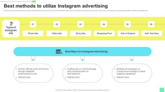 The following slide showcases Instagram advertising tips to promote products and attain higher reach. It includes elements such as photo, video, story, shopping ads, utilizing capabilities, building campaigns etc. Slidegeeks is here to make your presentations a breeze with Best Methods To Utilize Instagram Introduction To Niche Marketing Audience Segmentation Introduction Pdf With our easy to use and customizable templates, you can focus on delivering your ideas rather than worrying about formatting. With a variety of designs to choose from, you are sure to find one that suits your needs. And with animations and unique photos, illustrations, and fonts, you can make your presentation pop. So whether you are giving a sales pitch or presenting to the board, make sure to check out Slidegeeks first The following slide showcases Instagram advertising tips to promote products and attain higher reach. It includes elements such as photo, video, story, shopping ads, utilizing capabilities, building campaigns etc.