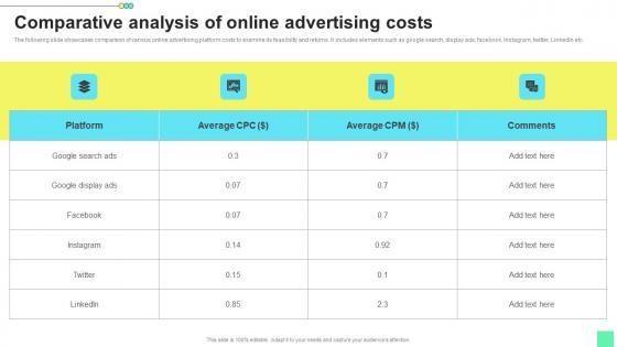 The following slide showcases comparison of various online advertising platform costs to examine its feasibility and returns. It includes elements such as google search, display ads, facebook, Instagram, twitter, LinkedIn etc. If you are looking for a format to display your unique thoughts, then the professionally designed Comparative Analysis Of Online Introduction To Niche Marketing Audience Segmentation Background Pdf is the one for you. You can use it as a Google Slides template or a PowerPoint template. Incorporate impressive visuals, symbols, images, and other charts. Modify or reorganize the text boxes as you desire. Experiment with shade schemes and font pairings. Alter, share or cooperate with other people on your work. Download Comparative Analysis Of Online Introduction To Niche Marketing Audience Segmentation Background Pdf and find out how to give a successful presentation. Present a perfect display to your team and make your presentation unforgettable. The following slide showcases comparison of various online advertising platform costs to examine its feasibility and returns. It includes elements such as google search, display ads, facebook, Instagram, twitter, LinkedIn etc.