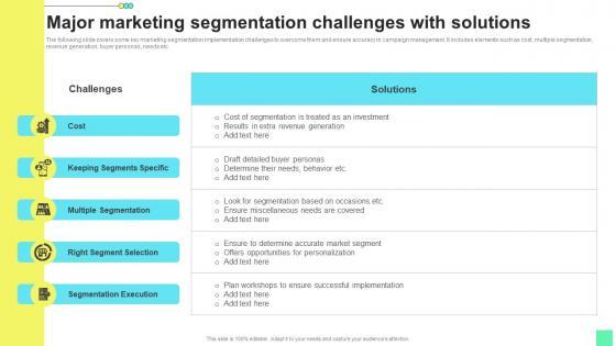 The following slide covers some key marketing segmentation implementation challenges to overcome them and ensure accuracy in campaign management. It includes elements such as cost, multiple segmentation, revenue generation, buyer personas, needs etc. Presenting this PowerPoint presentation, titled Major Marketing Segmentation Introduction To Niche Marketing Audience Segmentation Clipart Pdf, with topics curated by our researchers after extensive research. This editable presentation is available for immediate download and provides attractive features when used. Download now and captivate your audience. Presenting this Major Marketing Segmentation Introduction To Niche Marketing Audience Segmentation Clipart Pdf. Our researchers have carefully researched and created these slides with all aspects taken into consideration. This is a completely customizable Major Marketing Segmentation Introduction To Niche Marketing Audience Segmentation Clipart Pdf that is available for immediate downloading. Download now and make an impact on your audience. Highlight the attractive features available with our PPTs. The following slide covers some key marketing segmentation implementation challenges to overcome them and ensure accuracy in campaign management. It includes elements such as cost, multiple segmentation, revenue generation, buyer personas, needs etc.
