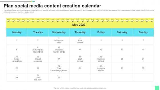 The following slide depicts social media content planning calendar to diversify content and develop audience interests. It includes elements such as brainstorming ideas, drafting relevant keyword list, researching industry trends, collecting resources, tracking engagement etc. Present like a pro with Plan Social Media Content Introduction To Niche Marketing Audience Segmentation Guidelines Pdf Create beautiful presentations together with your team, using our easy to use presentation slides. Share your ideas in real time and make changes on the fly by downloading our templates. So whether you are in the office, on the go, or in a remote location, you can stay in sync with your team and present your ideas with confidence. With Slidegeeks presentation got a whole lot easier. Grab these presentations today. The following slide depicts social media content planning calendar to diversify content and develop audience interests. It includes elements such as brainstorming ideas, drafting relevant keyword list, researching industry trends, collecting resources, tracking engagement etc.