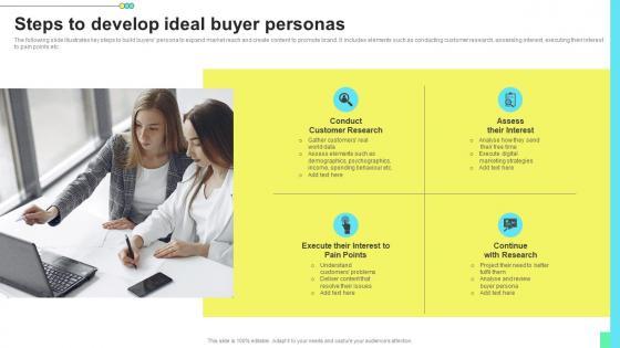 The following slide illustrates key steps to build buyers persona to expand market reach and create content to promote brand. It includes elements such as conducting customer research, assessing interest, executing their interest to pain points etc. If your project calls for a presentation, then Slidegeeks is your go to partner because we have professionally designed, easy to edit templates that are perfect for any presentation. After downloading, you can easily edit Steps To Develop Ideal Buyer Introduction To Niche Marketing Audience Segmentation Infographics Pdf and make the changes accordingly. You can rearrange slides or fill them with different images. Check out all the handy templates The following slide illustrates key steps to build buyers persona to expand market reach and create content to promote brand. It includes elements such as conducting customer research, assessing interest, executing their interest to pain points etc.