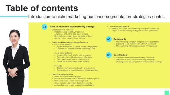Boost your pitch with our creative Table Of Contents Introduction To Niche Marketing Audience Segmentation Strategies Diagrams Pdf. Deliver an awe inspiring pitch that will mesmerize everyone. Using these presentation templates you will surely catch everyones attention. You can browse the ppts collection on our website. We have researchers who are experts at creating the right content for the templates. So you do not have to invest time in any additional work. Just grab the template now and use them. Our Table Of Contents Introduction To Niche Marketing Audience Segmentation Strategies Diagrams Pdf are topically designed to provide an attractive backdrop to any subject. Use them to look like a presentation pro.