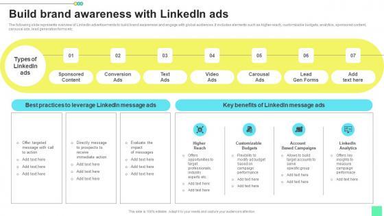 The following slide represents overview of LinkedIn advertisements to build brand awareness and engage with global audiences. It includes elements such as higher reach, customizable budgets, analytics, sponsored content, carousal ads, lead generation forms etc. Whether you have daily or monthly meetings, a brilliant presentation is necessary. Build Brand Awareness With Linkedin Introduction To Niche Marketing Audience Segmentation Formats Pdf can be your best option for delivering a presentation. Represent everything in detail using Build Brand Awareness With Linkedin Introduction To Niche Marketing Audience Segmentation Formats Pdf and make yourself stand out in meetings. The template is versatile and follows a structure that will cater to your requirements. All the templates prepared by Slidegeeks are easy to download and edit. Our research experts have taken care of the corporate themes as well. So, give it a try and see the results. The following slide represents overview of LinkedIn advertisements to build brand awareness and engage with global audiences. It includes elements such as higher reach, customizable budgets, analytics, sponsored content, carousal ads, lead generation forms etc.