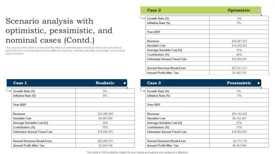 The purpose of this slide is to examine the effects of potential future events on the home care start-up performance by considering numerous different outcomes, including optimistic, pessimistic, and nominal case scenarios. Are you searching for a Go To Market Strategy Scenario Analysis With Optimistic Pessimistic And Nominal Cases Formats Pdf that is uncluttered, straightforward, and original It is easy to edit, and you can change the colors to suit your personal or business branding. For a presentation that expresses how much effort you have put in, this template is ideal With all of its features, including tables, diagrams, statistics, and lists, it is perfect for a business plan presentation. Make your ideas more appealing with these professional slides. Download Go To Market Strategy Scenario Analysis With Optimistic Pessimistic And Nominal Cases Formats Pdf from Slidegeeks today. The purpose of this slide is to examine the effects of potential future events on the home care start-up performance by considering numerous different outcomes, including optimistic, pessimistic, and nominal case scenarios.