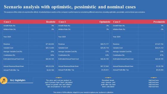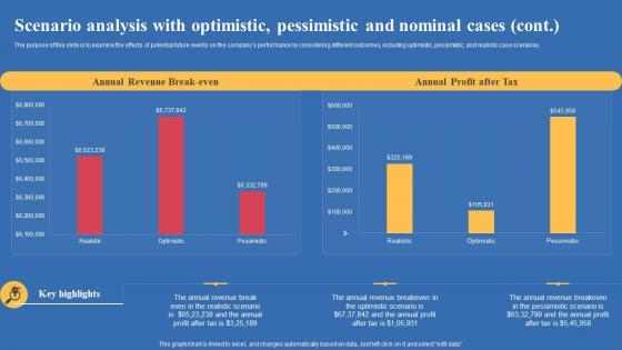 The purpose of this slide is to examine the effects of potential future events on the companys performance by considering different outcomes, including optimistic, pessimistic, and nominal case scenarios. Find a pre-designed and impeccable Scenario Analysis With Optimistic Pessimistic And Nominal Cases Export Business Plan Sample Pdf The templates can ace your presentation without additional effort. You can download these easy-to-edit presentation templates to make your presentation stand out from others. So, what are you waiting for Download the template from Slide geeks today and give a unique touch to your presentation. The purpose of this slide is to examine the effects of potential future events on the companys performance by considering different outcomes, including optimistic, pessimistic, and nominal case scenarios.