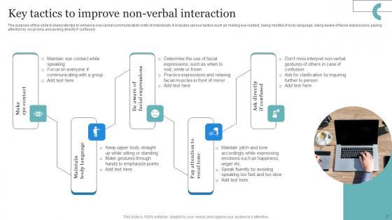 The purpose of this slide to elaborate tips to enhance non-verbal communication skills of individuals. It includes various tactics such as making eye contact, being mindful of body language, being aware of facial expressions, paying attention to vocal tone and asking directly if confused. Showcasing this set of slides titled Key Tactics To Improve Non Verbal Interaction Microsoft Pdf. The topics addressed in these templates are Maintain Body Language, Pay Attention To Vocal Tone, Ask Directly If Confused. All the content presented in this PPT design is completely editable. Download it and make adjustments in color, background, font etc. as per your unique business setting. The purpose of this slide to elaborate tips to enhance non-verbal communication skills of individuals. It includes various tactics such as making eye contact, being mindful of body language, being aware of facial expressions, paying attention to vocal tone and asking directly if confused.