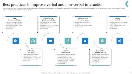 The purpose of this slide is to showcase strategies to enhance communication skills of sales employees. It includes various techniques such as thinking before speaking, always being mindful of tone, paying attention to body language, listen actively, understanding audience etc. Showcasing this set of slides titled Best Practices To Improve Verbal And Non Verbal Interaction Topics Pdf. The topics addressed in these templates are Understand Audience, Speak Confidently, Verbal And Non Verbal Interaction. All the content presented in this PPT design is completely editable. Download it and make adjustments in color, background, font etc. as per your unique business setting. The purpose of this slide is to showcase strategies to enhance communication skills of sales employees. It includes various techniques such as thinking before speaking, always being mindful of tone, paying attention to body language, listen actively, understanding audience etc.