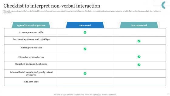 This slide represents a checklist in order to identify interest of person in communication through non verbal actions. It includes non verbal gestures such as arms open or on table, furrowed eyebrows and tight lips, making eye contact etc. Showcasing this set of slides titled Checklist To Interpret Non Verbal Interaction Microsoft Pdf. The topics addressed in these templates are Non Verbal Actions, Non Verbal Gestures, Furrowed Eyebrows. All the content presented in this PPT design is completely editable. Download it and make adjustments in color, background, font etc. as per your unique business setting. This slide represents a checklist in order to identify interest of person in communication through non verbal actions. It includes non verbal gestures such as arms open or on table, furrowed eyebrows and tight lips, making eye contact etc.
