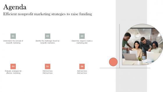 Boost your pitch with our creative Agenda Efficient Nonprofit Marketing Strategies To Raise Funding Infographics Pdf. Deliver an awe-inspiring pitch that will mesmerize everyone. Using these presentation templates you will surely catch everyones attention. You can browse the ppts collection on our website. We have researchers who are experts at creating the right content for the templates. So you do not have to invest time in any additional work. Just grab the template now and use them. Our Agenda Efficient Nonprofit Marketing Strategies To Raise Funding Infographics Pdf are topically designed to provide an attractive backdrop to any subject. Use them to look like a presentation pro.