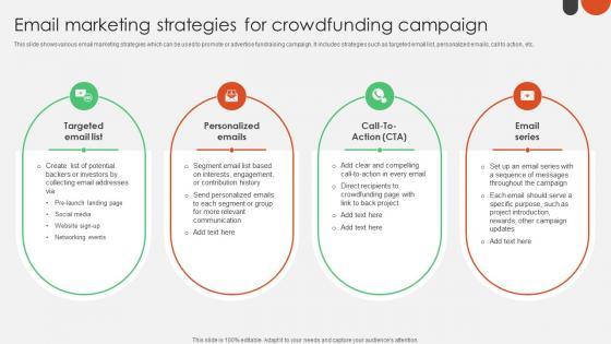 This slide shows various email marketing strategies which can be used to promote or advertise fundraising campaign. It includes strategies such as targeted email list, personalized emails, call to action, etc. Are you in need of a template that can accommodate all of your creative concepts This one is crafted professionally and can be altered to fit any style. Use it with Google Slides or PowerPoint. Include striking photographs, symbols, depictions, and other visuals. Fill, move around, or remove text boxes as desired. Test out color palettes and font mixtures. Edit and save your work, or work with colleagues. Download Email Marketing Strategies For Crowdfunding For Nonprofits To Support Fin SS V and observe how to make your presentation outstanding. Give an impeccable presentation to your group and make your presentation unforgettable. This slide shows various email marketing strategies which can be used to promote or advertise fundraising campaign. It includes strategies such as targeted email list, personalized emails, call to action, etc.