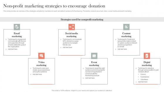 This slide provides an overview of the strategies adopted by marketers to reach and attract audience for fundraising. The tactics covered are email, video, social media and event marketing.Slidegeeks is one of the best resources for PowerPoint templates. You can download easily and regulate Non Profit Marketing Strategies To Encourage Donation Efficient Nonprofit Marketing Icons Pdf for your personal presentations from our wonderful collection. A few clicks is all it takes to discover and get the most relevant and appropriate templates. Use our Templates to add a unique zing and appeal to your presentation and meetings. All the slides are easy to edit and you can use them even for advertisement purposes. This slide provides an overview of the strategies adopted by marketers to reach and attract audience for fundraising. The tactics covered are email, video, social media and event marketing.