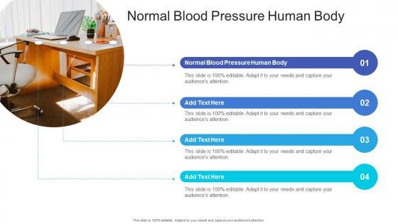 Presenting our innovatively designed set of slides titled Normal Blood Pressure Human Body In Powerpoint And Google Slides Cpb. This completely editable PowerPoint graphic exhibits Normal Blood Pressure Human Body that will help you convey the message impactfully. It can be accessed with Google Slides and is available in both standard screen and widescreen aspect ratios. Apart from this, you can download this well structured PowerPoint template design in different formats like PDF, JPG, and PNG. So, click the download button now to gain full access to this PPT design. Our Normal Blood Pressure Human Body In Powerpoint And Google Slides Cpb are topically designed to provide an attractive backdrop to any subject. Use them to look like a presentation pro.