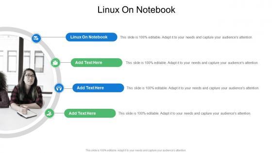 Introducing our well-designed Linux On Notebook In Powerpoint And Google Slides Cpb. This PowerPoint design presents information on topics like Linux On Notebook. As it is predesigned it helps boost your confidence level. It also makes you a better presenter because of its high-quality content and graphics. This PPT layout can be downloaded and used in different formats like PDF, PNG, and JPG. Not only this, it is available in both Standard Screen and Widescreen aspect ratios for your convenience. Therefore, click on the download button now to persuade and impress your audience. Our Linux On Notebook In Powerpoint And Google Slides Cpb are topically designed to provide an attractive backdrop to any subject. Use them to look like a presentation pro.