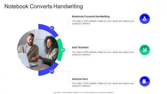 Presenting our innovatively-designed set of slides titled Notebook Converts Handwriting In Powerpoint And Google Slides Cpb. This completely editable PowerPoint graphic exhibits Notebook Converts Handwriting that will help you convey the message impactfully. It can be accessed with Google Slides and is available in both standard screen and widescreen aspect ratios. Apart from this, you can download this well-structured PowerPoint template design in different formats like PDF, JPG, and PNG. So, click the download button now to gain full access to this PPT design. Our Notebook Converts Handwriting In Powerpoint And Google Slides Cpb are topically designed to provide an attractive backdrop to any subject. Use them to look like a presentation pro.
