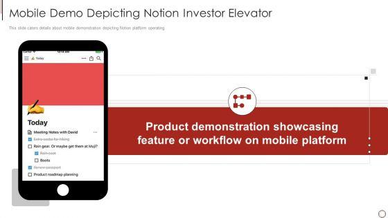 This slide caters details about mobile demonstration depicting Notion platform operating. This is a notion investor elevator mobile demo depicting notion investor elevator pictures pdf template with various stages. Focus and dispense information on one stages using this creative set, that comes with editable features. It contains large content boxes to add your information on topics like mobile platform. You can also showcase facts, figures, and other relevant content using this PPT layout. Grab it now.