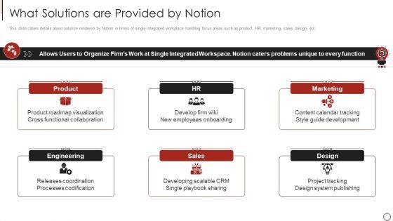 This slide caters details about solution rendered by Notion in terms of single integrated workplace handling focus areas such as product, HR, marketing, sales, design, etc. Presenting notion investor elevator what solutions are provided by notion themes pdf to provide visual cues and insights. Share and navigate important information on six stages that need your due attention. This template can be used to pitch topics like product, marketing, engineering, sales, design. In addtion, this PPT design contains high resolution images, graphics, etc, that are easily editable and available for immediate download.