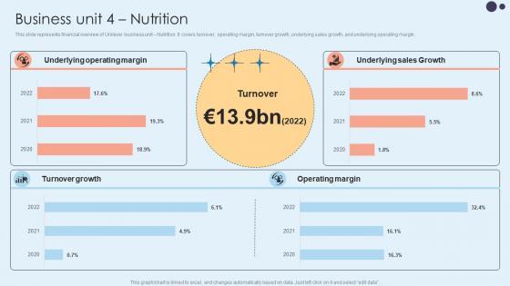 This slide represents financial overview of Unilever business unit Nutrition. It covers turnover, operating margin, turnover growth, underlying sales growth, and underlying operating margin.Do you have to make sure that everyone on your team knows about any specific topic I yes, then you should give Business Unit 4 Nutrition Home Care Solutions Company Profile CP SS V a try. Our experts have put a lot of knowledge and effort into creating this impeccable Business Unit 4 Nutrition Home Care Solutions Company Profile CP SS V. You can use this template for your upcoming presentations, as the slides are perfect to represent even the tiniest detail. You can download these templates from the Slidegeeks website and these are easy to edit. So grab these today This slide represents financial overview of Unilever business unit Nutrition. It covers turnover, operating margin, turnover growth, underlying sales growth, and underlying operating margin.