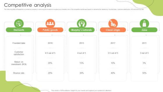 The following slide will assist an e-commerce company in showing the investors or audience a complete view of its competitive landscape based on elements like leaders by founded date, customer satisfaction, ROI and bounce rate. Want to ace your presentation in front of a live audience Our Competitive Analysis Healthy And Nutrition Provider Company Investor Funding Elevator Pitch Deck can help you do that by engaging all the users towards you. Slidegeeks experts have put their efforts and expertise into creating these impeccable powerpoint presentations so that you can communicate your ideas clearly. Moreover, all the templates are customizable, and easy-to-edit and downloadable. Use these for both personal and commercial use. The following slide will assist an e-commerce company in showing the investors or audience a complete view of its competitive landscape based on elements like leaders by founded date, customer satisfaction, ROI and bounce rate.