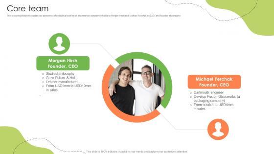The following slide showcases key personnel of executive team of an ecommerce company which are Morgan Hirsh and Michael Ferchak as CEO and founder of company. There are so many reasons you need a Core Team Healthy And Nutrition Provider Company Investor Funding Elevator Pitch Deck. The first reason is you can not spend time making everything from scratch, Thus, Slidegeeks has made presentation templates for you too. You can easily download these templates from our website easily. The following slide showcases key personnel of executive team of an ecommerce company which are Morgan Hirsh and Michael Ferchak as CEO and founder of company.