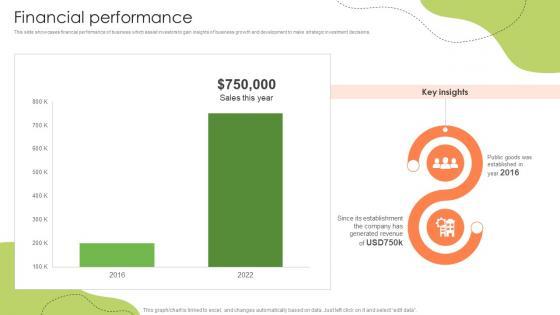 This slide showcases financial performance of business which assist investors to gain insights of business growth and development to make strategic investment decisions. Present like a pro with Financial Performance Healthy And Nutrition Provider Company Investor Funding Elevator Pitch Deck. Create beautiful presentations together with your team, using our easy-to-use presentation slides. Share your ideas in real-time and make changes on the fly by downloading our templates. So whether you are in the office, on the go, or in a remote location, you can stay in sync with your team and present your ideas with confidence. With Slidegeeks presentation got a whole lot easier. Grab these presentations today. This slide showcases financial performance of business which assist investors to gain insights of business growth and development to make strategic investment decisions.