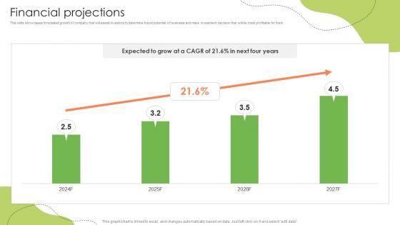 This slide showcases forecasted growth of company that will assist investors to determine future potential of business and make investment decision that will be most profitable for them. Slidegeeks is here to make your presentations a breeze with Financial Projections Healthy And Nutrition Provider Company Investor Funding Elevator Pitch Deck With our easy-to-use and customizable templates, you can focus on delivering your ideas rather than worrying about formatting. With a variety of designs to choose from, you are sure to find one that suits your needs. And with animations and unique photos, illustrations, and fonts, you can make your presentation pop. So whether you are giving a sales pitch or presenting to the board, make sure to check out Slidegeeks first This slide showcases forecasted growth of company that will assist investors to determine future potential of business and make investment decision that will be most profitable for them.