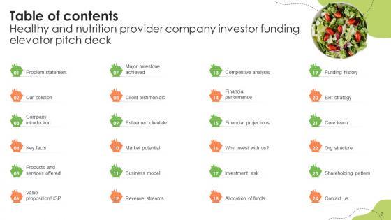 Welcome to our selection of the Table Of Contents Healthy And Nutrition Provider Company Investor Funding Elevator Pitch Deck. These are designed to help you showcase your creativity and bring your sphere to life. Planning and Innovation are essential for any business that is just starting out. This collection contains the designs that you need for your everyday presentations. All of our PowerPoints are 100 percent editable, so you can customize them to suit your needs. This multi-purpose template can be used in various situations. Grab these presentation templates today. Our Table Of Contents Healthy And Nutrition Provider Company Investor Funding Elevator Pitch Deck are topically designed to provide an attractive backdrop to any subject. Use them to look like a presentation pro.
