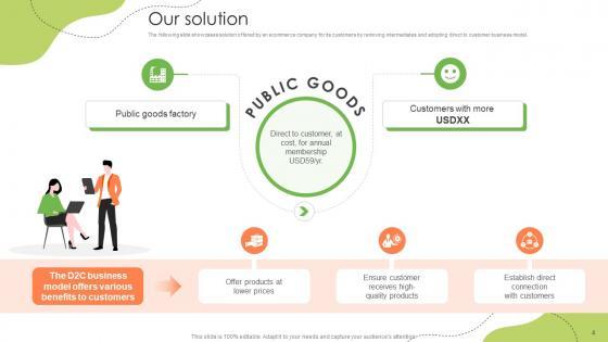 The following slide showcases solution offered by an ecommerce company for its customers by removing intermediates and adopting direct to customer business model. Make sure to capture your audiences attention in your business displays with our gratis customizable Our Solution Healthy And Nutrition Provider Company Investor Funding Elevator Pitch Deck. These are great for business strategies, office conferences, capital raising or task suggestions. If you desire to acquire more customers for your tech business and ensure they stay satisfied, create your own sales presentation with these plain slides. The following slide showcases solution offered by an ecommerce company for its customers by removing intermediates and adopting direct to customer business model.
