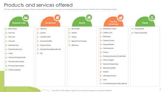 This slide represents several categories of different products offered by an ecommerce company to its customers which are personal care, household, home, food and beverage and plants. Coming up with a presentation necessitates that the majority of the effort goes into the content and the message you intend to convey. The visuals of a PowerPoint presentation can only be effective if it supplements and supports the story that is being told. Keeping this in mind our experts created Products And Services Offered Healthy And Nutrition Provider Company Investor Funding Elevator Pitch Deck to reduce the time that goes into designing the presentation. This way, you can concentrate on the message while our designers take care of providing you with the right template for the situation. This slide represents several categories of different products offered by an ecommerce company to its customers which are personal care, household, home, food and beverage and plants.