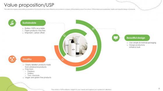 This slide showcases unique selling propositions of products and services offered by an ecommerce company differentiates product from others. Differentiators are sustainable, healthy and beautiful design of products. Explore a selection of the finest Value Proposition Usp Healthy And Nutrition Provider Company Investor Funding Elevator Pitch Deck here. With a plethora of professionally designed and pre-made slide templates, you can quickly and easily find the right one for your upcoming presentation. You can use our Value Proposition Usp Healthy And Nutrition Provider Company Investor Funding Elevator Pitch Deck to effectively convey your message to a wider audience. Slidegeeks has done a lot of research before preparing these presentation templates. The content can be personalized and the slides are highly editable. Grab templates today from Slidegeeks. This slide showcases unique selling propositions of products and services offered by an ecommerce company differentiates product from others. Differentiators are sustainable, healthy and beautiful design of products.