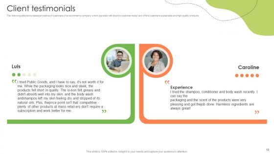 The following slide showcases perceptive of customers of an ecommerce company which operates with direct to customer model and offers customers sustainable and high quality products. Create an editable Client Testimonials Healthy And Nutrition Provider Company Investor Funding Elevator Pitch Deck that communicates your idea and engages your audience. Whether you are presenting a business or an educational presentation, pre-designed presentation templates help save time. Client Testimonials Healthy And Nutrition Provider Company Investor Funding Elevator Pitch Deck is highly customizable and very easy to edit, covering many different styles from creative to business presentations. Slidegeeks has creative team members who have crafted amazing templates. So, go and get them without any delay. The following slide showcases perceptive of customers of an ecommerce company which operates with direct to customer model and offers customers sustainable and high quality products.