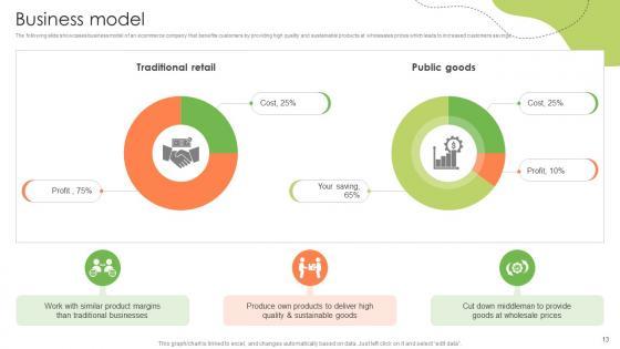 The following slide showcases business model of an ecommerce company that benefits customers by providing high quality and sustainable products at wholesales prices which leads to increased customers savings. Boost your pitch with our creative Business Model Healthy And Nutrition Provider Company Investor Funding Elevator Pitch Deck. Deliver an awe-inspiring pitch that will mesmerize everyone. Using these presentation templates you will surely catch everyones attention. You can browse the ppts collection on our website. We have researchers who are experts at creating the right content for the templates. So you do not have to invest time in any additional work. Just grab the template now and use them. The following slide showcases business model of an ecommerce company that benefits customers by providing high quality and sustainable products at wholesales prices which leads to increased customers savings.