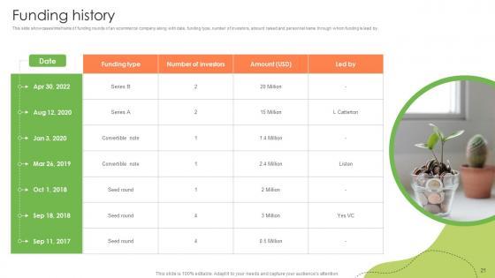 This slide showcases timeframe of funding rounds of an ecommerce company along with date, funding type, number of investors, amount raised and personnel name through whom funding is lead by. Do you have an important presentation coming up Are you looking for something that will make your presentation stand out from the rest Look no further than Funding History Healthy And Nutrition Provider Company Investor Funding Elevator Pitch Deck. With our professional designs, you can trust that your presentation will pop and make delivering it a smooth process. And with Slidegeeks, you can trust that your presentation will be unique and memorable. So why wait Grab Funding History Healthy And Nutrition Provider Company Investor Funding Elevator Pitch Deck today and make your presentation stand out from the rest This slide showcases timeframe of funding rounds of an ecommerce company along with date, funding type, number of investors, amount raised and personnel name through whom funding is lead by.