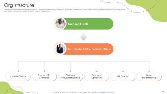 This slide showcases the organization structure of an IT company which includes founder and CEO, co-founder and chief solutions officer, creative director, director of e-commerce, director of product management, director of operations, HR director and head of partnerships. Crafting an eye-catching presentation has never been more straightforward. Let your presentation shine with this tasteful yet straightforward Org Structure Healthy And Nutrition Provider Company Investor Funding Elevator Pitch Deck template. It offers a minimalistic and classy look that is great for making a statement. The colors have been employed intelligently to add a bit of playfulness while still remaining professional. Construct the ideal Org Structure Healthy And Nutrition Provider Company Investor Funding Elevator Pitch Deck that effortlessly grabs the attention of your audience Begin now and be certain to wow your customers This slide showcases the organization structure of an IT company which includes founder and CEO, co-founder and chief solutions officer, creative director, director of e-commerce, director of product management, director of operations, HR director and head of partnerships.