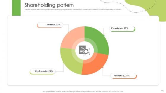 The slide highlights the company ownership structure highlighting percentage of shareholders. Shareholders consists of investors, founders and co-founders. This Shareholding Pattern Healthy And Nutrition Provider Company Investor Funding Elevator Pitch Deck is perfect for any presentation, be it in front of clients or colleagues. It is a versatile and stylish solution for organizing your meetings. The Shareholding Pattern Healthy And Nutrition Provider Company Investor Funding Elevator Pitch Deck features a modern design for your presentation meetings. The adjustable and customizable slides provide unlimited possibilities for acing up your presentation. Slidegeeks has done all the homework before launching the product for you. So, do not wait, grab the presentation templates today The slide highlights the company ownership structure highlighting percentage of shareholders. Shareholders consists of investors, founders and co-founders.