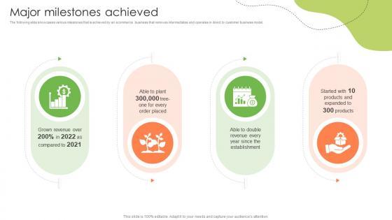 The following slide showcases various milestones that is achieved by an ecommerce business that removes intermediates and operates in direct to customer business model. If you are looking for a format to display your unique thoughts, then the professionally designed Major Milestones Achieved Healthy And Nutrition Provider Company Investor Funding Elevator Pitch Deck is the one for you. You can use it as a Google Slides template or a PowerPoint template. Incorporate impressive visuals, symbols, images, and other charts. Modify or reorganize the text boxes as you desire. Experiment with shade schemes and font pairings. Alter, share or cooperate with other people on your work. Download Major Milestones Achieved Healthy And Nutrition Provider Company Investor Funding Elevator Pitch Deck and find out how to give a successful presentation. Present a perfect display to your team and make your presentation unforgettable. The following slide showcases various milestones that is achieved by an ecommerce business that removes intermediates and operates in direct to customer business model.