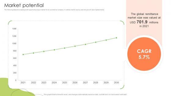 The following slide showcases growth opportunity lying in market for an ecommerce company. It outlines market size by year and growth rate of global market.Are you in need of a template that can accommodate all of your creative concepts This one is crafted professionally and can be altered to fit any style. Use it with Google Slides or PowerPoint. Include striking photographs, symbols, depictions, and other visuals. Fill, move around, or remove text boxes as desired. Test out color palettes and font mixtures. Edit and save your work, or work with colleagues. Download Market Potential Healthy And Nutrition Provider Company Investor Funding Elevator Pitch Deck and observe how to make your presentation outstanding. Give an impeccable presentation to your group and make your presentation unforgettable. The following slide showcases growth opportunity lying in market for an ecommerce company. It outlines market size by year and growth rate of global market.