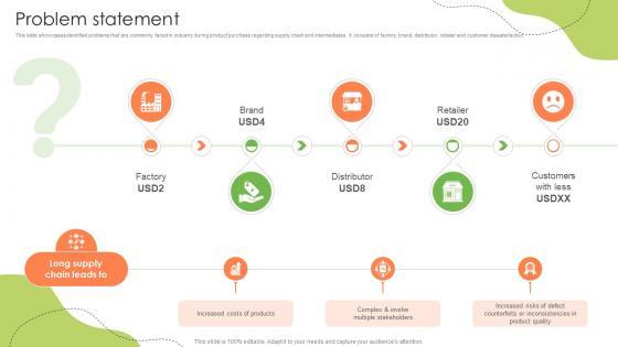 This slide showcases identified problems that are commonly faced in industry during product purchase regarding supply chain and intermediates. It consists of factory, brand, distributor, retailer and customer dissatisfaction. Formulating a presentation can take up a lot of effort and time, so the content and message should always be the primary focus. The visuals of the PowerPoint can enhance the presenters message, so our Problem Statement Healthy And Nutrition Provider Company Investor Funding Elevator Pitch Deck was created to help save time. Instead of worrying about the design, the presenter can concentrate on the message while our designers work on creating the ideal templates for whatever situation is needed. Slidegeeks has experts for everything from amazing designs to valuable content, we have put everything into Problem Statement Healthy And Nutrition Provider Company Investor Funding Elevator Pitch Deck. This slide showcases identified problems that are commonly faced in industry during product purchase regarding supply chain and intermediates. It consists of factory, brand, distributor, retailer and customer dissatisfaction.