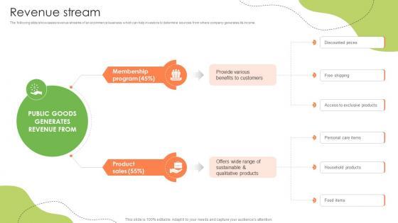 The following slide showcases revenue streams of an ecommerce business which can help investors to determine sources from where company generates its income. This modern and well-arranged Revenue Stream Healthy And Nutrition Provider Company Investor Funding Elevator Pitch Deck provides lots of creative possibilities. It is very simple to customize and edit with the Powerpoint Software. Just drag and drop your pictures into the shapes. All facets of this template can be edited with Powerpoint, no extra software is necessary. Add your own material, put your images in the places assigned for them, adjust the colors, and then you can show your slides to the world, with an animated slide included. The following slide showcases revenue streams of an ecommerce business which can help investors to determine sources from where company generates its income.